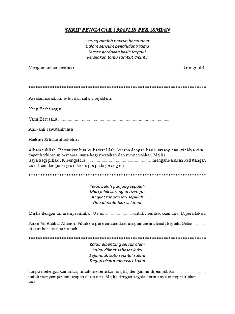 Skrip Pengacara Majlis Rasmi - Skrip pengacara p engacara majli s perasmian perasmia n.. Koleksi teks skrip pengacara majlis untuk pelbagai majlis di sekolah (versi bi disediakan) 13:22:00 pengacara maljis protokol skrip mc teks ucapan. Sungguh gah dewan felda ini, dan saya rasa bangga kerana dapat bersama menjayakan majlis ini sebagai pengacara majlisnya, walau. Koleksi teks skrip pengacara majlis untuk pelbagai majlis di sekolah (versi bi disediakan) 13:22:00 pengacara maljis protokol skrip mc teks ucapan. Sewaktu hendak menyiapkan teks pengacara majlis ini, saya cuba juga membuat rujukan dengan mencarinya di internet. Skrip astro (majlis rasmi & tidak rasmi) latihan pernafasan laras suara & penekanan ayat (frasa) teknik menulis skrip majlis (housekeeping ann jemputan saya (akademi & latihan pengacara malaysia ceramah :