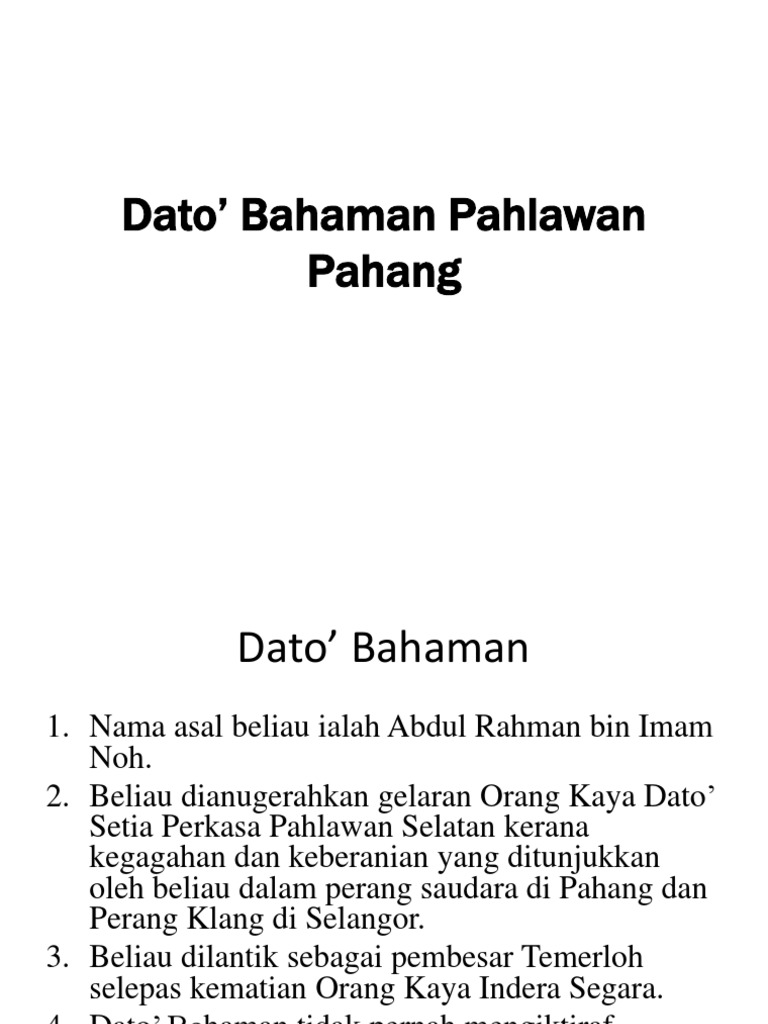 Adalah seorang pahlawan terkenal di pahang,malaysia. Dato bahaman merupakan salah seorang tokoh pahlawan melayu negara yang bangkit menentang. Seorang orang besar raja (seorang lelaki yang. Nama sebenar beliau ialah abdul rahman bin tuanku imam nuh. Kini, kami akan membawa bersama semangat sedemikian, dan menjaga tanahair.