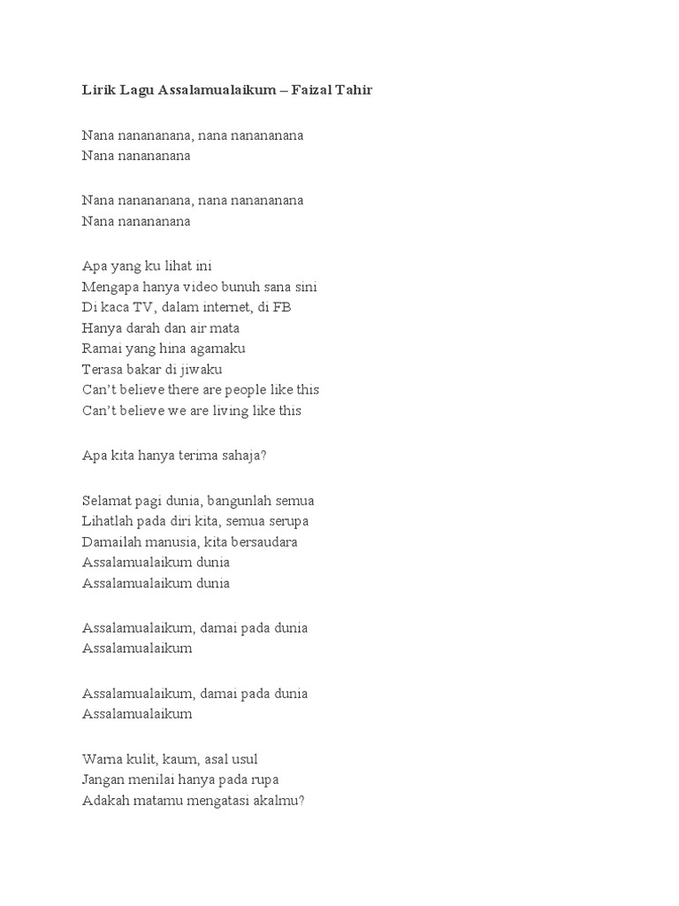 Faizal tahir sayang official music video. Assalamualaikum nana nanananana, nana nanananana nana nanananana nana nanananana, na. Faizal tahir assalamualaikum official video. Assalamualaikum damai pada dunia assalamualaikum assalamualaikum damai pada dunia assalamualaikum. Assalamualaikum dunia, bangunlah semua lihatlah pada diri kita, semua serupa damailah manusia, kita bersaudara assalamualaikum dunia assalamualaikum dunia.