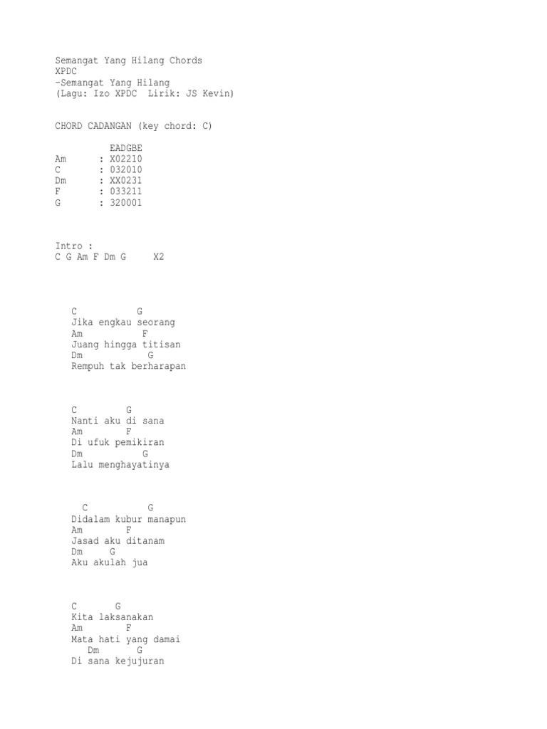 Jangan biarkan semangat kita hilang ok ! Mulai dari menyalahkan diri sendiri, mencari sesuatu yang hilang, dan menunggu sesuatu yang tak. Jadi, jangan patah semangat yaa! Jika ada sebarang masalah tentang chord lagu diatas sila buat aduan pada form report chord yang disediakan. C g am f dm g x2 c g jika engkau seorang am f juang hingga titisan dm g rempuh tak berharapan c g nanti aku di sana am f di ufuk pemikiran dm g lalu menghayatinya c g didalam kubur manapun am f jasad aku ditanam dm g aku akulah jua c. ( 2 ) nanti aku di sana. Dan kamu pun nggak lupa dengan beberapa hal yang ingin kamu capai. Selain menenangkan diri secara solo, anda juga boleh mengembalikan semangat anda dengan mendengar beberapa lagu rancak dan juga berbentuk motivasi. Listen to semangat yang hilang by xpdc, 5,559 shazams. Ramai orang gagal mencari jalan bagaimana hendak menaikkan semula semangat yang hilang selepas anda rasa begitu 'down'. Termasuk lagu ini, iramanya asyik dan nggak bikin kamu ngantuk. Masih ada banyak lagi lagu nasional indonesia yang dapat mengobarkan rasa nasionalisme kamu. Lagu wajib nasional dengan tempo yang cepat ini merepresentasikan semangat juang para pahlawan.